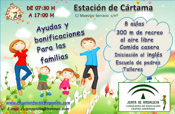 Educación infantil integral en Estación de CártamaEn el Centro de Educación Infantil Campanilla le ofrecemos desde Estación de Cártama, Málaga, una amplia experiencia en la educación, atención y cuidado de niños pequeños. Para que sepa dónde localizarnos, en la presente sección le ofrecemos nuestros datos de contacto. Ponemos a su disposición un centro perfectamente equipado.